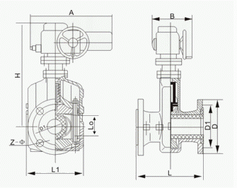 | 公稱 | 公稱 | 工作 | L | L1 | L0 | D | D1 | Z-Φ | H | 電動(dòng)裝置 | ||||