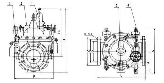 當(dāng)閥門從進(jìn)口端給水時,水流過針閥進(jìn)入主閥控制室,出口壓力通過導(dǎo)管作用到導(dǎo)閥上。當(dāng)出口壓力高于導(dǎo)閥彈簧設(shè)定值時,導(dǎo)閥關(guān)閉。控制室停止排水,此時主閥控制室內(nèi)壓力升高并關(guān)閉主閥,出口壓力不再升高。